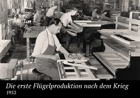 Die Fertigung von Flügeln mit 10 Instrumenten im Jahr folgt 1952. Bereits 1954 erreicht die Gesamtproduktion 720 Flügel und Klaviere pro Jahr. Hauptprodukte bleiben aber Möbel für Kindergärten und Schulen, Wohn- und Schlafzimmer, Bleistifte und Sportgeräte.
